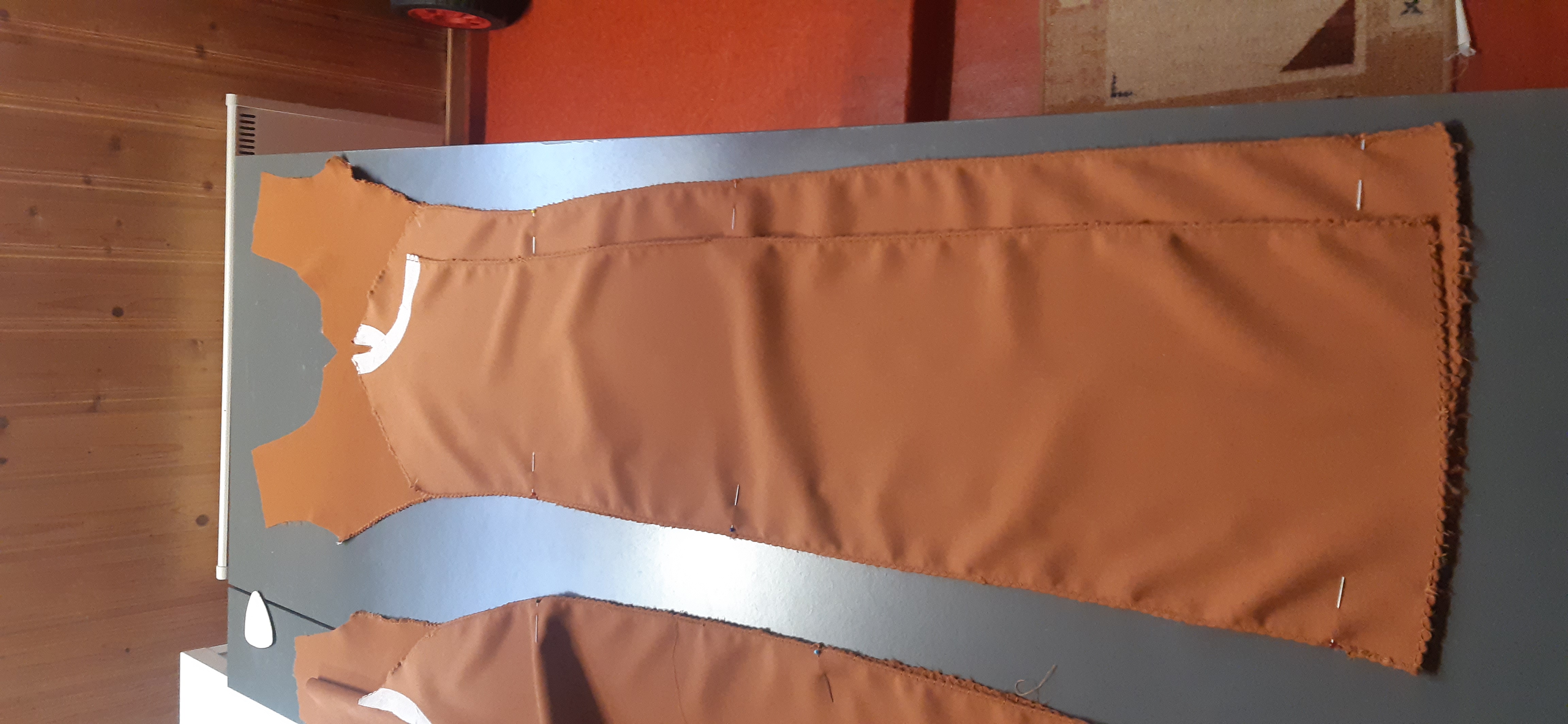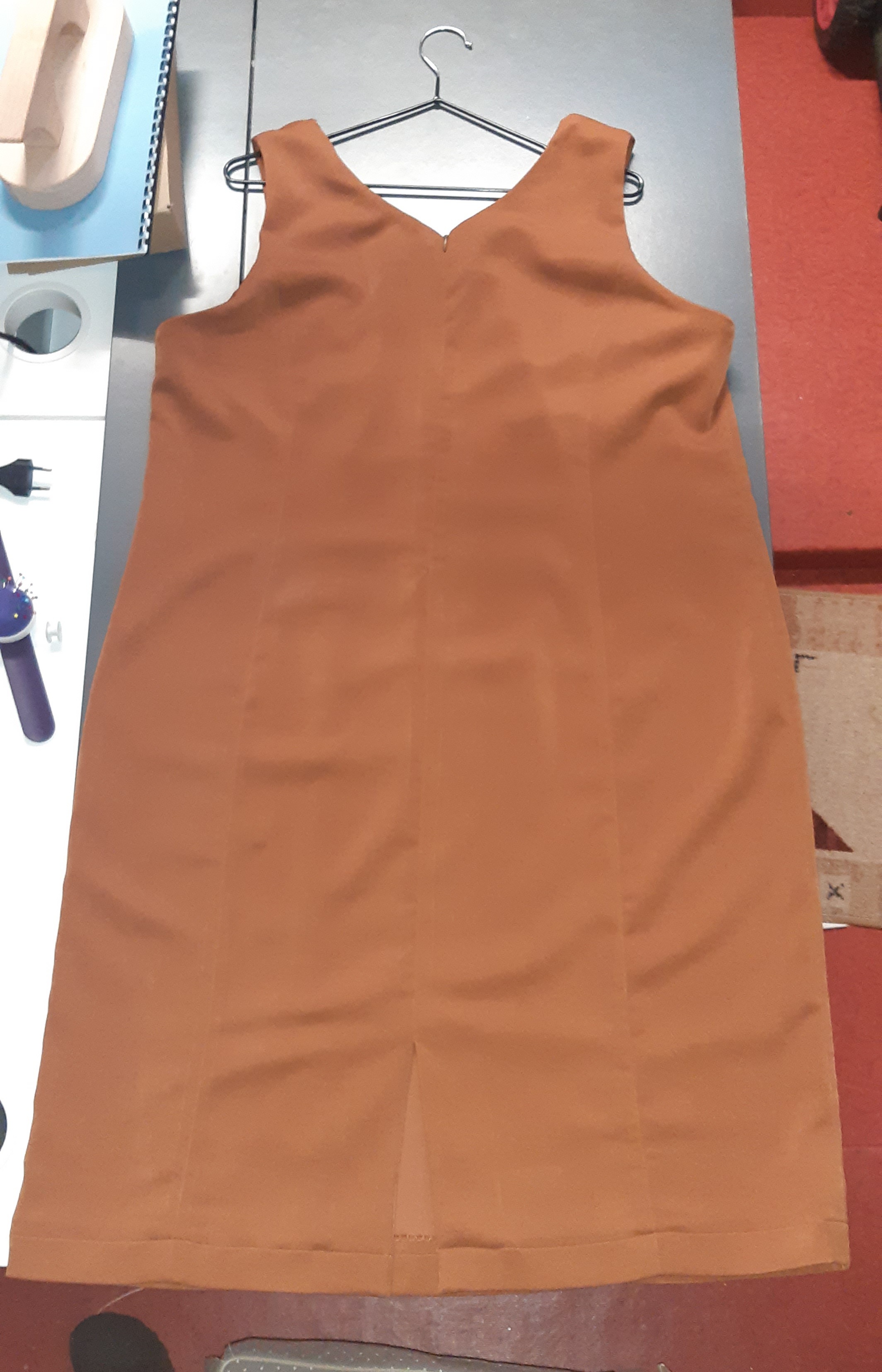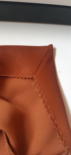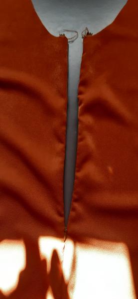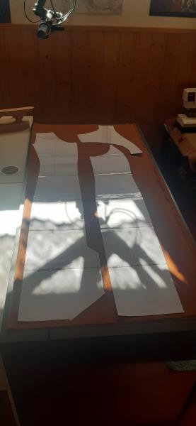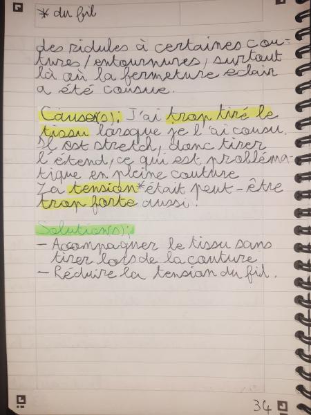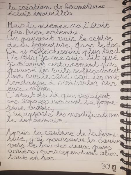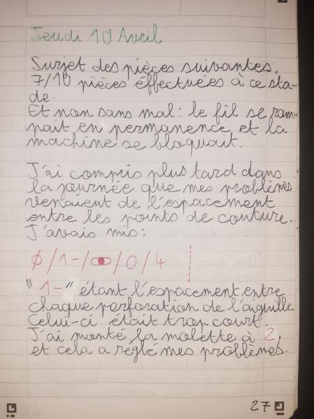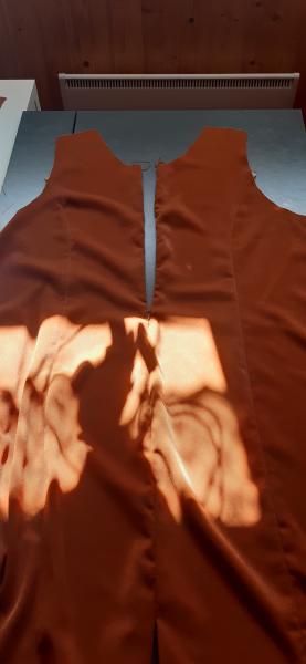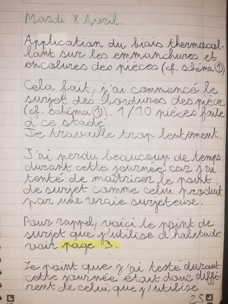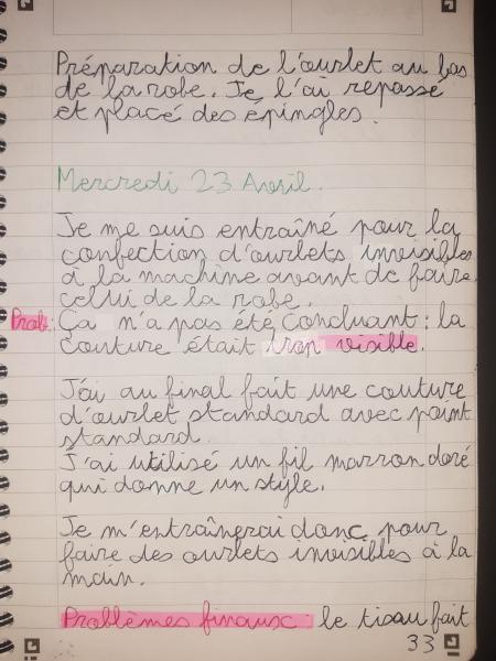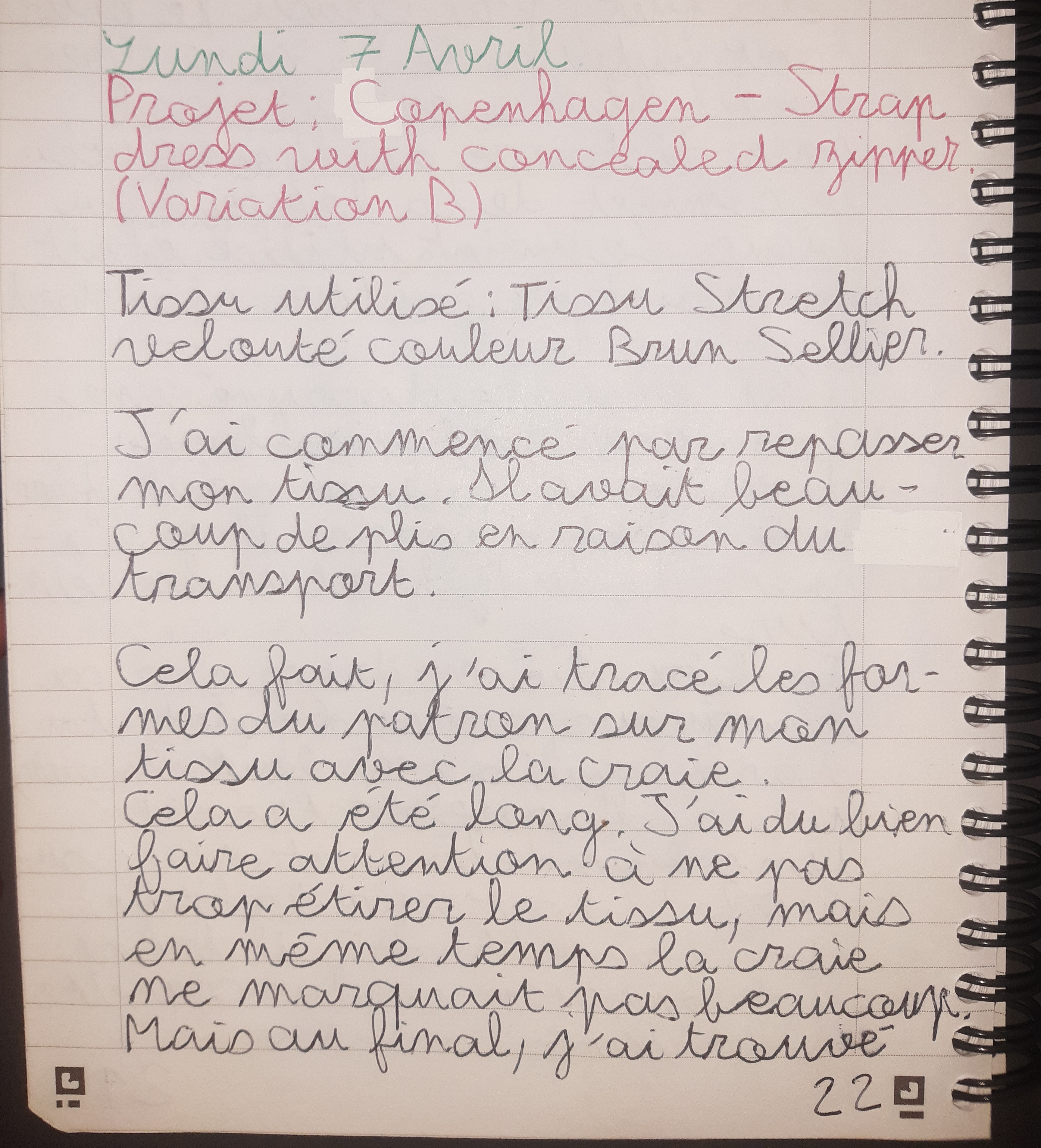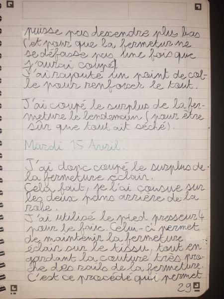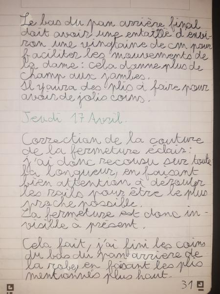 Du 7 Avril au 23 Avril (16 jours). Mon troisième ouvrage, une robe en tissu stretch velouté avec une fermeture éclair invisible. Le tracé a été quelque peu fastidieux, car le tissu s’étirait si trop de pression était effectuée. Je n’ai pas eu de souci particulier au niveau de la couture.