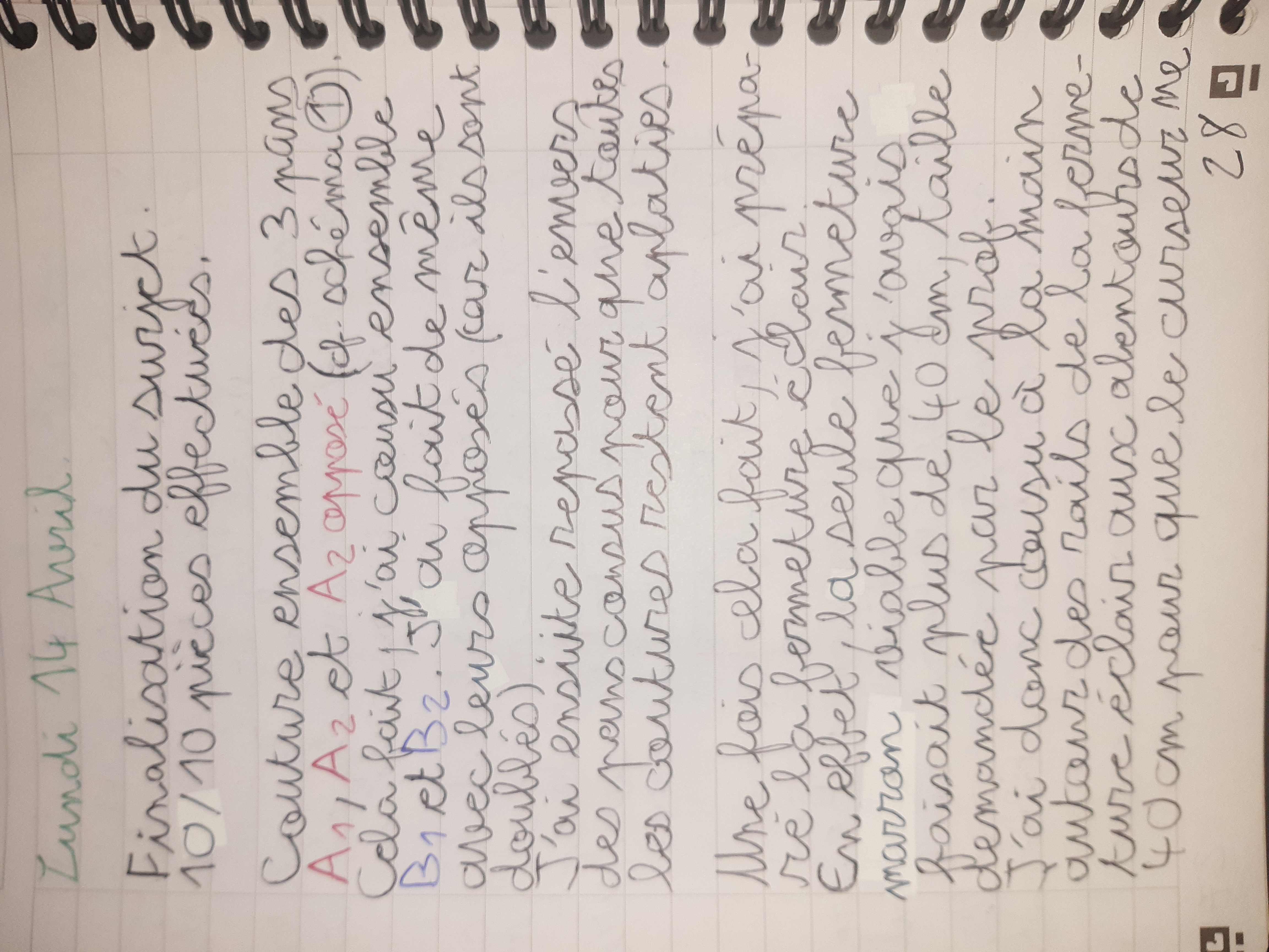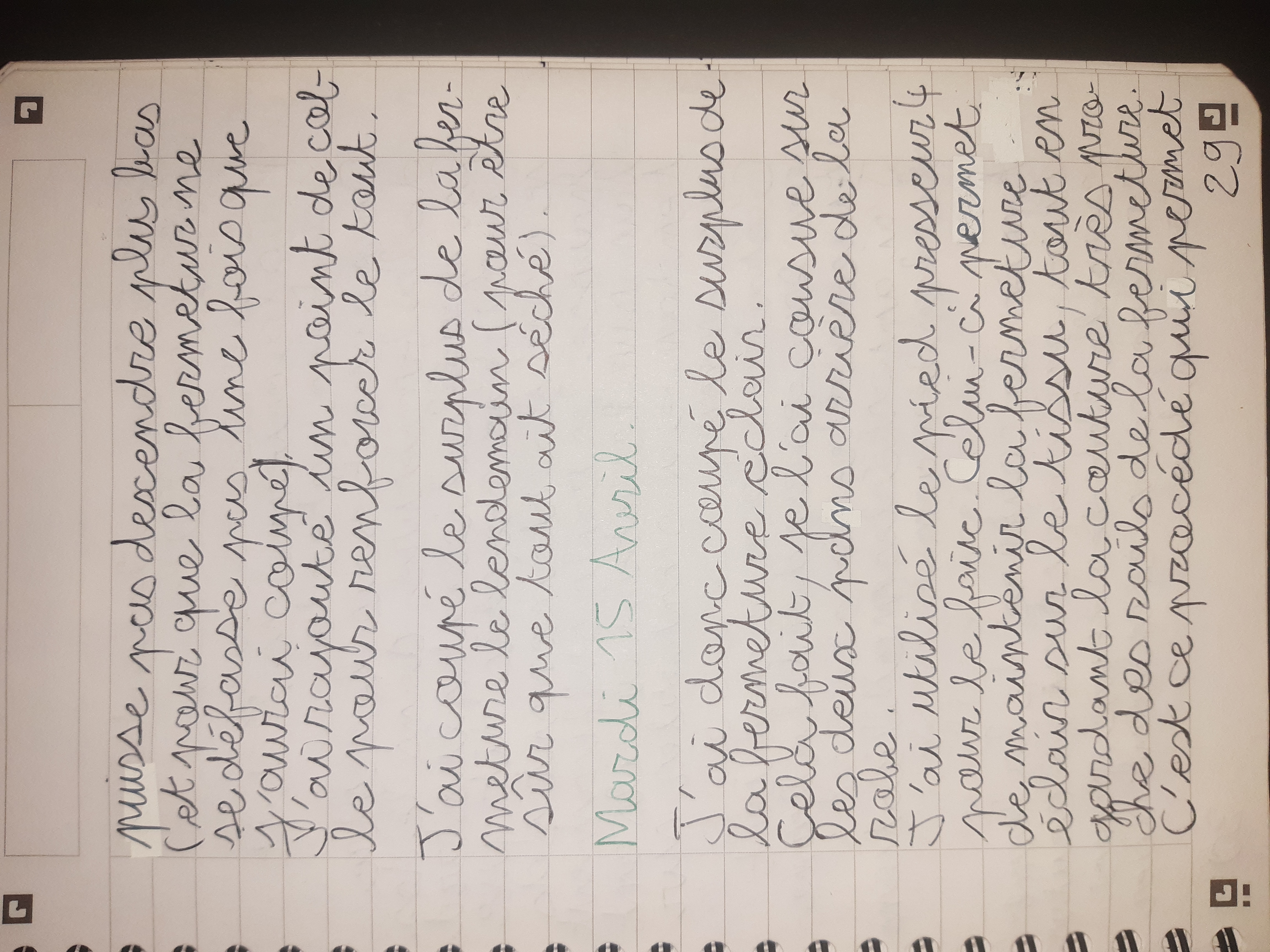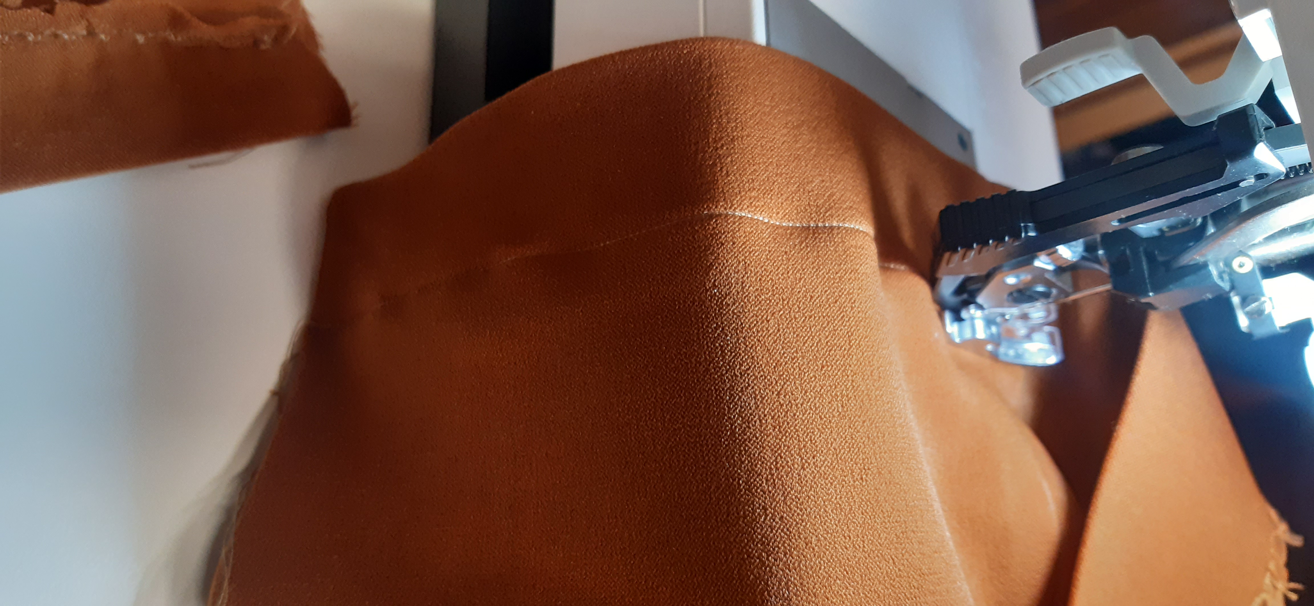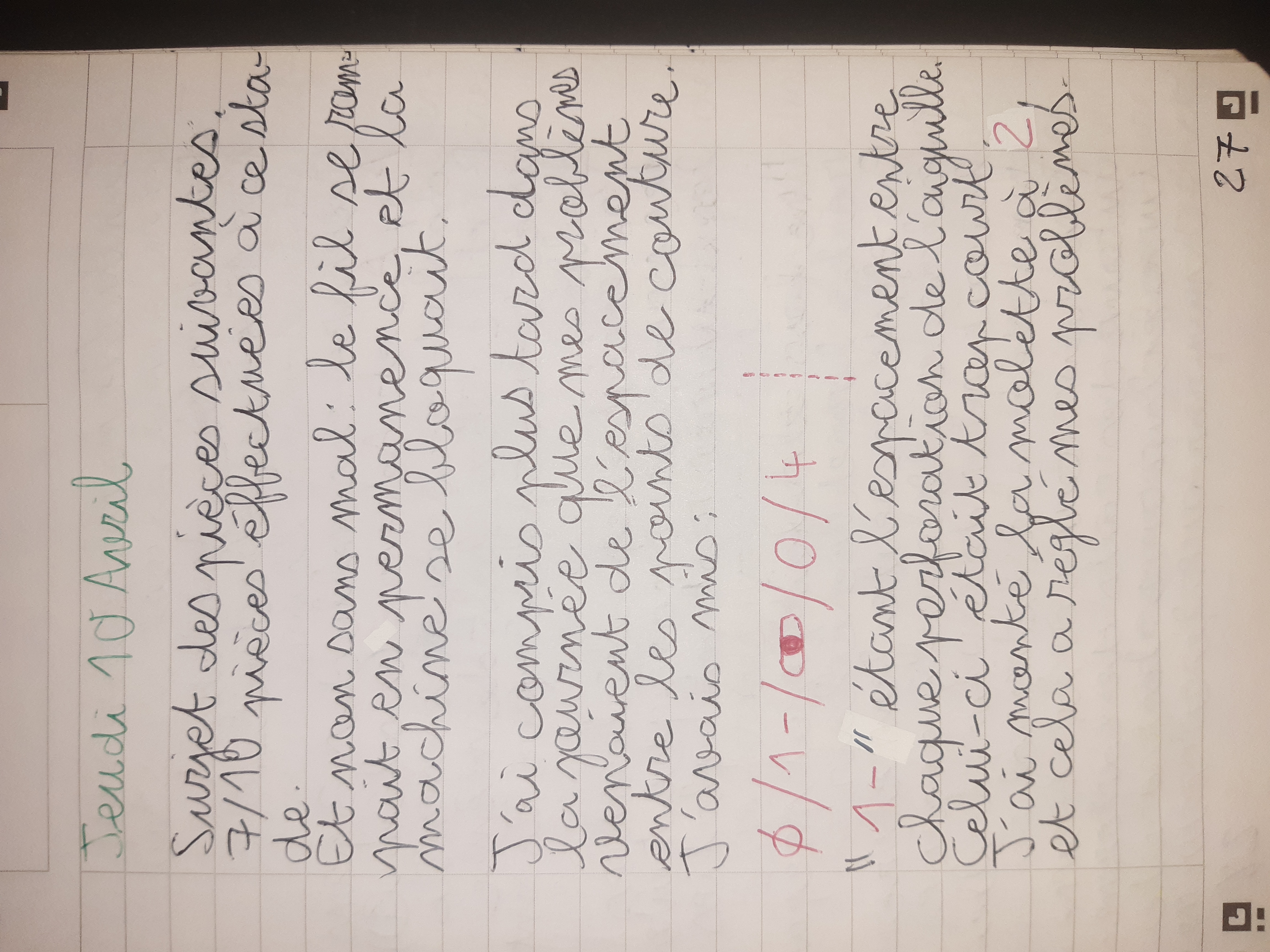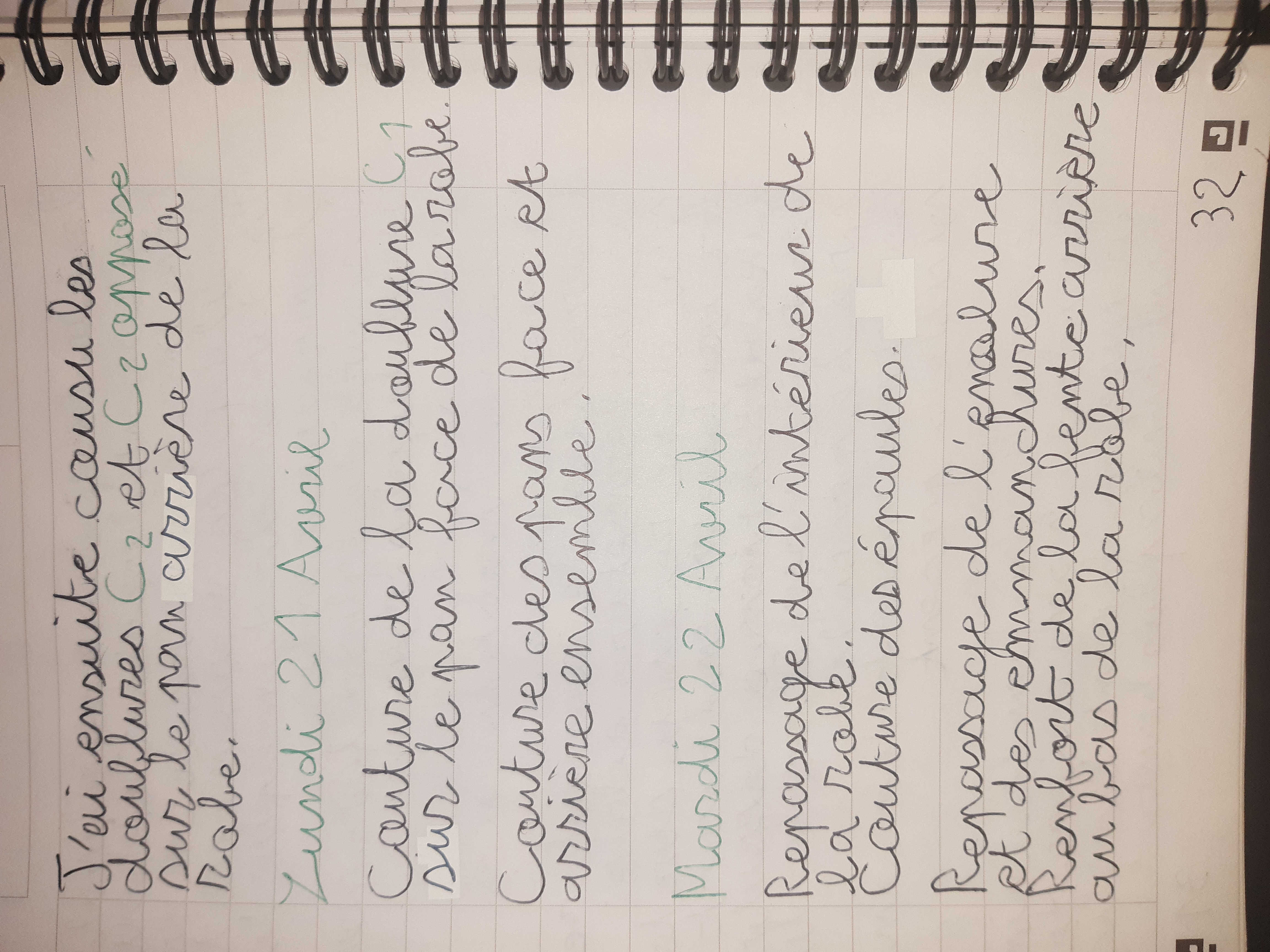 Du 7 Avril au 23 Avril (16 jours). Mon troisième ouvrage, une robe en tissu stretch velouté avec une fermeture éclair invisible. Le tracé a été quelque peu fastidieux, car le tissu s’étirait si trop de pression était effectuée. Je n’ai pas eu de souci particulier au niveau de la couture.